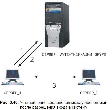 Skype – программное обеспечение для VoIP, обеспечивающее бесплатную голосовую связь через Интернет между компьютерами, а также платные услуги для связи с абонентами обычной телефонной сети. В отличие от многих других программ IP‑телефонии, для передачи данных Skype использует P2P‑архитектуру. Каталог пользователей Skype распределен по компьютерам пользователей сети Skype, что позволяет сети легко масштабироваться до очень больших размеров (в данный момент более 100 миллионов пользователей, пять‑десять миллионов онлайн) без дорогой инфраструктуры централизиро‑ванных серверов. Кроме того, Skype может маршрутизировать звонки через компьютеры других пользователей. Это позволяет соединяться друг с другом пользователям, находящимися за NAT или брандмауэром, однако создает дополнительную нагрузку на компьютеры и каналы пользователей, подключенных к Интернету напрямую. Используемый программой Skype алгоритм сжатия данных ILBC позволяет в большинстве случаев достигать качества, превышающего качество обычной телефонной связи. Однако низкокачественные микрофоны, широко распространенные сейчас на рынке ПК, нивелируют это преимущество. В программе используется уникальный подход к реализации общения между абонентами, путем прямого соединения между компьютерами. Абонент_1 обращается к серверу аутентификации Skype с разрешением входа в систему (1). Сервер аутентификации Skype проверяет учетные данные Абонента_1 и разрешает ему вход в систему (2). После этого Абонент_1 обращается непосредственно к Абоненту_2 (3) и устанавливает с ним прямое соединение (рис. 3.40).