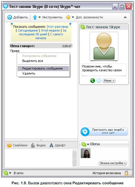 Очень легко случайно нажать на кнопку отправки, не проверив то, что написано, а потом заметить ошибку. Последние версии Skype позволяют редактировать уже отправленные сообщения. Для этого необходимо правой кнопкой мыши щелкнуть на уже отправленном сообщении в чате, которое нужно изменить или удалить целиком, и выбрать команду Редактировать сообщение (рис. 1.9). Этой функцией можно пользоваться, если у каждого участника чата установлена последняя версия Skype.