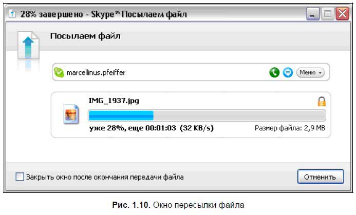 Пересылка и прием файлов возможны только с разрешения абонентов, процесс пересылки отображается в специальном окне (рис. 1.10), в котором указан абонент для пересылки, имя файла, размер, время передачи, скорость отправки.