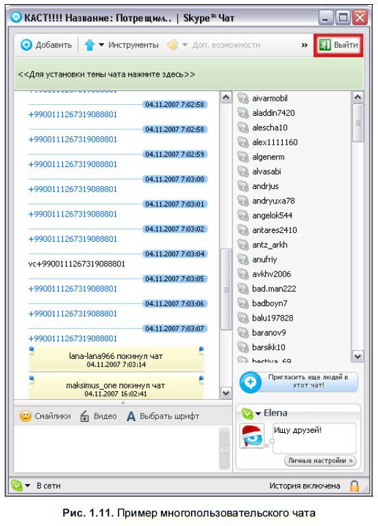 Многопользовательские чаты Skype – это обычные чаты, но с одним лишь отличием, что в разговоре могут участвовать все присоединившиеся (рис. 1.11). Это дает прекрасную возможность познакомиться с людьми, которые разделяют ваши интересы. Многопользовательские чаты Skype можно анонсировать в сетевых дневниках, на веб‑сайтах, по электронной почте и, конечно же, в индикаторах настроения Skype. Если вы увидите что‑то, заинтересовавшее вас, просто щелкайте по ссылке и присоединяйтесь к разговору.
