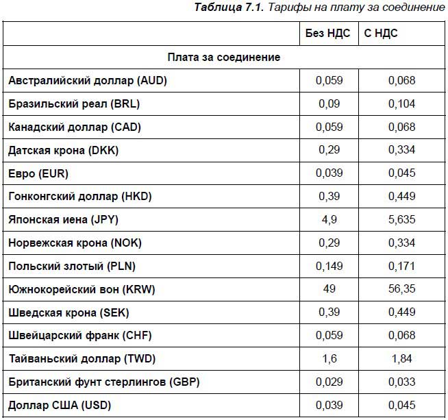При звонках в рамках программы Talk for Britain и программы неограниченных звонков Skype по США и Канаде плата за соединение не взимается. Чтобы получить возможность звонить через SkypeOut, необходимо пополнить счет Skype. Перечень действующих тарифов на плату за соединение указан в табл. 7.1.
