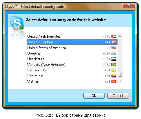 2. Включите надстройку, щелкнув на ней левой кнопкой мыши. Далее щелкните на треугольничке для вызова команд надстройки Skype. Выберите команду Change default country for this website (Изменить страну по умолчанию для этой веб‑страницы). 3. В открывшемся диалоговом окне (рис. 3.23) в качестве страны по умолчанию укажите ту страну, флаг которой указан в номере. В нашем примере это United Kingdom (Великобритания). Нажмите кнопку OK .
