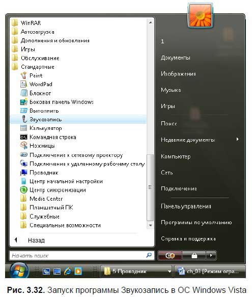 При этом вы должны отчетливо слышать свой голос и иметь возможность регулировать громкость воспроизведения. Если голос не слышен, то, вероятно, неправильно подключены аудиоустройства либо есть неполадки со звуковой платой. В операционной системе Windows Vista переход к программе осуществляется с помощью команды Пуск | Все программы | Стандартные | Звукозапись (рис. 3.32).