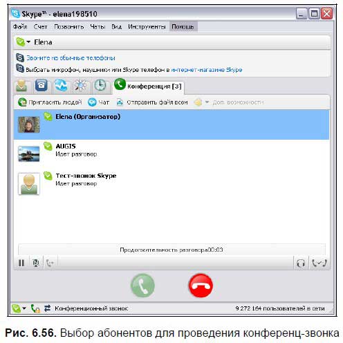 Начнется вызов выбранных абонентов. 3. На вкладке Конференция будет видно, до кого из участников удалось дозвониться (рис. 6.56).