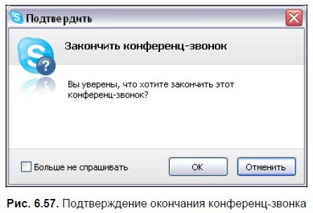 Когда кто‑то из участников «вешает трубку», то разговор продолжается, если же «трубку повесит» организатор, то разговор будет окончен для всех участников телеконференции. 5. В открывшемся окне подтверждения окончания конференц‑звонка нажмите кнопку OK (рис. 6.57). Если вы не хотите, чтобы это окно появлялось каждый раз при прекращении конференц‑звонка, установите флажок Больше не спрашивать .