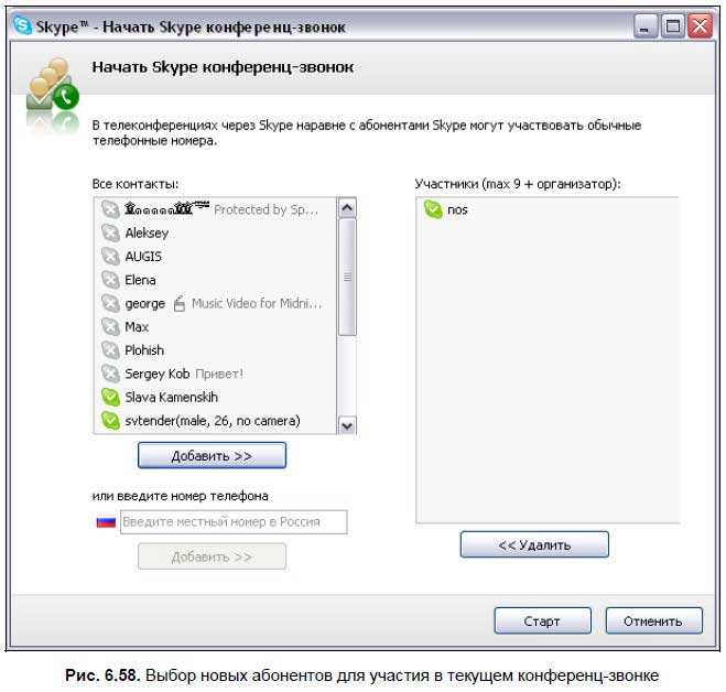 В открывшемся диалоговом окне в списке контактов укажите новых участников разговора и нажмите кнопку Добавить >> (рис. 6.58). Для начала звонка нажмите кнопку Старт . При этом текущий конференц‑звонок продолжается, вне зависимости, ответит ли вызываемый абонент на звонок.