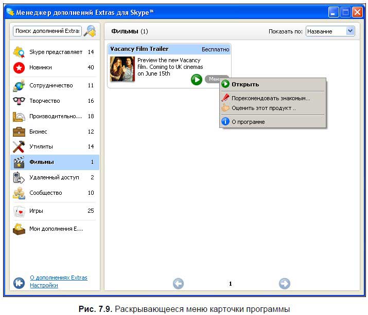 Диалоговое окно содержит следующие вкладки: □ Skype представляет – ряд программ и игр, рекомендованных Skype; □ Новинки – программы и игры, вышедшие в текущем месяце; □ Сотрудничество – программы для проведения конференций, в том числе видеоконференций, работы с документами, файлами; □ Творчество – программы для добавления звукового файла, создания настроения, работы с аватаром и другие шуточные программы; □ Производительность – программы, повышающие производительность Skype, например, запись видео и аудиозвонков, перевод текстовых сообщений с одного языка на другой, создание расписания; □ Бизнес – программы работы с протоколами, поддержки удаленного доступа, программы, разработанные специально для предприятий; □ Утилиты – различные вспомогательные программы, а также «детектор лжи», составление гороскопов, клуб знакомств, медицинский «менеджер пилюль» с напоминанием; □ Фильмы – анонсы новых фильмов с возможностью просмотреть рекламный ролик; □ Удаленный доступ – включает программы отправки SMS‑сообщений пользователям Skype и удаленных звонков пользователям Skype с любого телефона; □ Сообщество – различные группы, а также база данных для объединения абонентов Skype; □ Игры – разнообразные игры, шашки, шахматы, нарды, головоломки и другие; □ Мои дополнения Extras – содержит программы, которые вы уже скачали. Сортировка программ осуществляется в поле Показать по (см. рис. 7.8) по дате создания, названию, цене, рейтингу среди других программ. Пункты Карточки и Подробнее служат для задания режимов просмотра. Каждая карточка с программой содержит свое собственное меню (рис. 7.9).