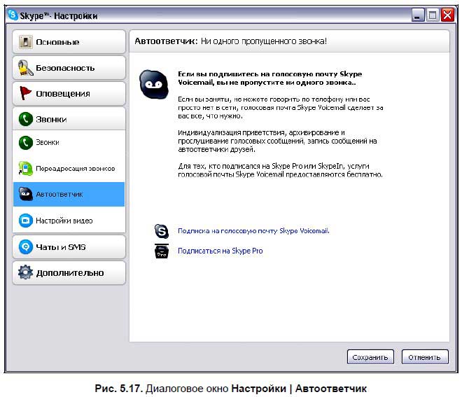Если абонент занят, не может говорить по телефону или его просто нет в сети, то автоответчик сделает для него все, что нужно. С его помощью возможна индивидуализация приветствия, архивирование и прослушивание голосовых сообщений, запись сообщений на автоответчики друзей. Работа автоответчика возможна лишь в том случае, если пользователь программы Skype является абонентом голосовой почты Skype Voicemail. В диалоговом окне Настройки | Автоответчик можно подписаться на голосовую почту Skype Voicemail и Skype Pro. Настройки видео описаны уже в общих настройках, хотя эта опция есть и в разделе Настройки | Звонки | Настройки видео . | |