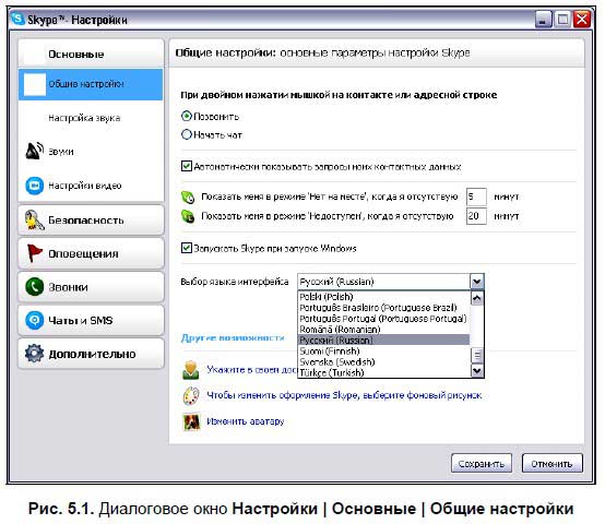 Каждый человек имеет свои привычки. И программа Skype уважительно относится к своим пользователям и их привычкам. Поэтому вызов команды Файл | Изменить режим в сети позволяет выбрать состояние Настроить переадресацию звонков, при активации которого появляется диалоговое окно Настройки . При выборе Настройки | Основные | Общие настройки появится диалоговое окно, представленное на рис. 5.1.