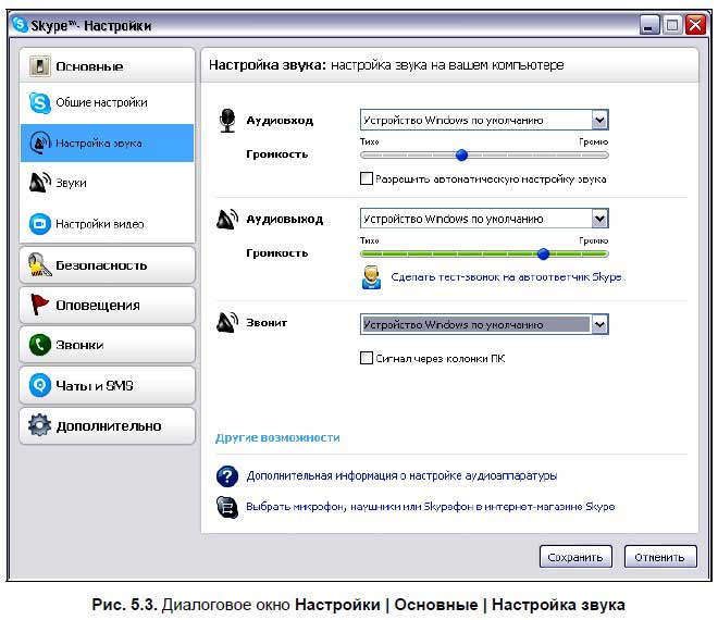 Настройку звука на своем компьютере можно производить в соответствующем диалоговом окне Настройки | Основные | Настройка звука (рис. 5.3), предварительно выбрав в левой части окна одноименную команду.