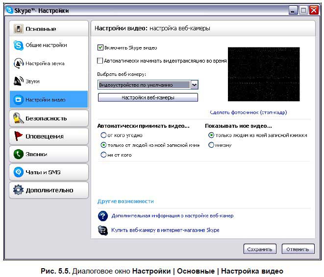 В этом диалоговом окне можно выбрать веб‑камеру (заданную по умолчанию или из других устройств), настроить параметры работы веб‑камеры (ее включение или автоматическое начало видеотрансляции во время звонков или нахождения в чате), задать условия автоматического приема видео (от кого угодно, ни от кого, только от абонентов из личной записной книжки), задать условия показа личного видео (никому, только абонентам из личной записной книжки).