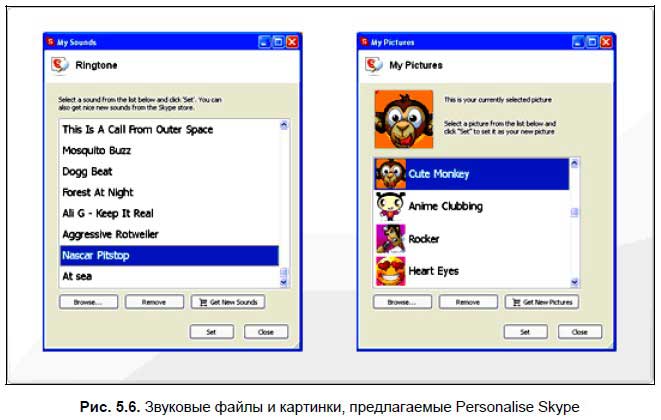 Personalise Skype поможет вам создать свой собственный неповторимый Skype. Найдите себе мелодию, которая заставит вас улыбаться каждый раз, когда вам звонят друзья. Выберите фотографию, увидев которую все поймут, что вам плохо, и, может быть, кто‑то позвонит, чтобы подбодрить вас (рис. 5.6).