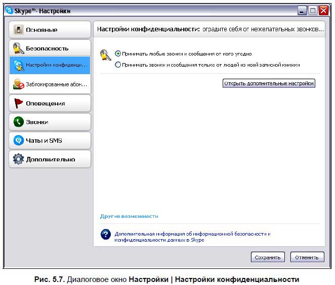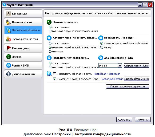 Если открыть дополнительные настройки, то диалоговое окно Настройки | Настройки конфиденциальности преобразуется к виду, представленному на рис. 5.8. Оно помогает более тщательно выполнить настройки по приему видео и принятию участия в чате.
