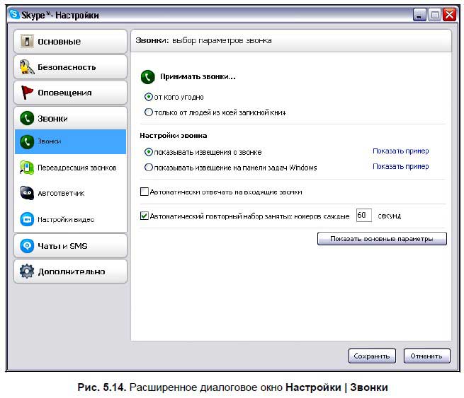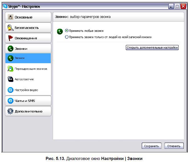 В диалоговом окне Настройки | Звонки с помощью переключателя можно выбрать вариант Принимать любые звонки или вариант Принимать звонки только от людей из моей записной книжки . Однако можно увеличить количество параметров настройки звонков, нажав кнопку Открыть дополнительные настройки . Появится диалоговое окно, представленное на рис. 5.14.