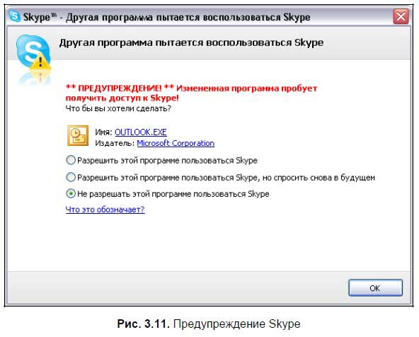 7. Убедитесь, что программа Skype работает. Запустите почтовую программу Microsoft Outlook. Появится окно с предупреждающим сообщением о попытке использования Skype другой программой (Microsoft Outlook) (рис. 3.11).