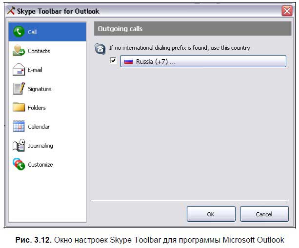 Выберите переключатель Разрешить Этой программе пользоваться Skype и нажмите кнопку OK . 8. В окне программы Microsoft Outlook должно появиться диалоговое окно настроек панели инструментов Skype (рис. 3.12).