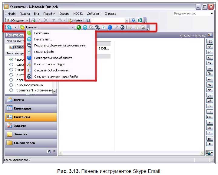 9. После задания настроек панели Skype Toolbar for Outlook в диалоговом окне нажмите кнопку OK . Панель инструментов Skype Email в программе Microsoft Outlook показана на рис. 3.13.