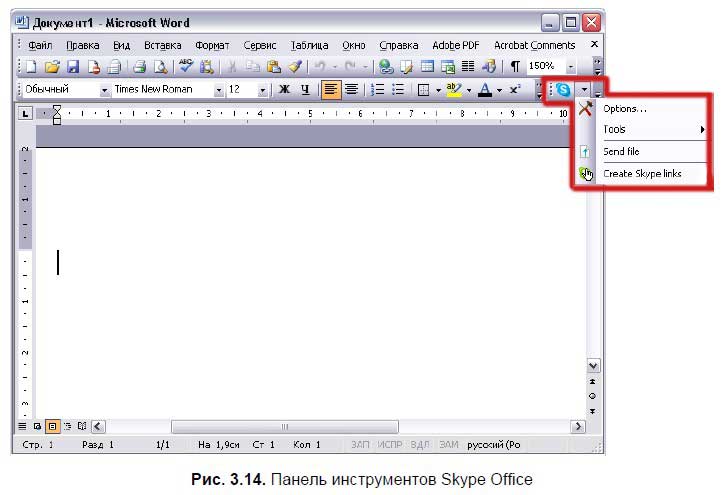 Установка панели инструментов Skype Office аналогична установке панели инструментов Skype Email. С помощью панели инструментов Skype Office (рис. 3.14) возможно: □ набирать телефонные номера и имена Skype из файлов, открытых в MS Word, Excel или PowerPoint;