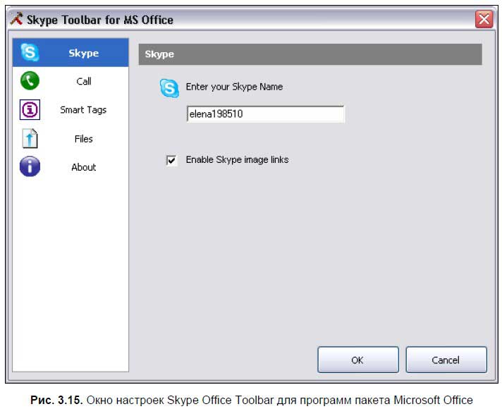 В диалоговом окне можно задать следующие параметры: Skype (Skype), Call (Звонок), Smart Tags (Всплывающие теги), Files (Файлы), About (Комментарий). Более подробно об интеграции возможностей программ Skype и Microsoft Office написано в Главе 8. | |