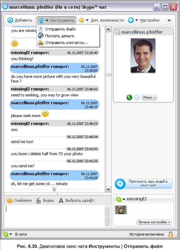С помощью программы Skype можно легко обмениваться файлами непосредственно во время разговора или чата или в любое другое время. Отправка файла возможна одному или нескольким абонентам Skype. Очень интересно обмениваться фотографиями, музыкальными файлами, это разнообразит ваш чат или разговор. Но, принимая файл от незнакомого человека, есть опасность получить вирус либо информацию непристойного характера, так как просмотреть содержимое файлов можно только после загрузки. Обращайте внимание на расширение передаваемых файлов, оно может о многом сказать. Обязательно проверяйте на наличие вирусов файлы с расширениями exe, bat, cmd, vbs и другие исполняемые файлы. Файлы с расширениями tif, jpg, bmp, psd безопасны, так как являются графическими. Музыкальные файлы имеют расширения mp3, wma, wav, cda. Если планируется передача нескольких файлов, целесообразно создать архив zip или rar. Пересылка и прием файла из чатаПересылка файла. Переслать файл можно, находясь в чате, с помощью команды Инструменты | Отправить файл (рис. 6.30).