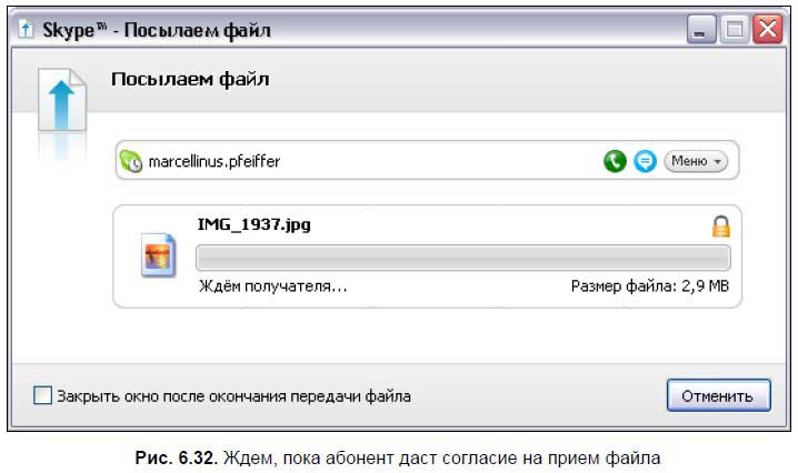 Одновременно у абонента, которому вы отправите файл, появится окно с вопросом, разрешить ли прием файла. Если абонент разрешит прием, то начнется передача файла (рис. 6.33).