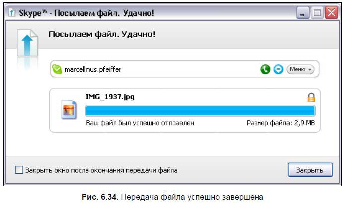 Обратите внимание, чтобы абонент смог принять ваш файл, он должен находиться в сети и разрешить пересылку файла во всплывающем окне. По окончании передачи появится сообщение, что файл был успешно отправлен (рис. 6.34).