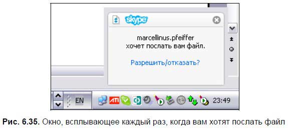 Теперь абонент сможет открыть посланный вами файл! Прием файла. Абоненты также могут прислать вам свои файлы. Как только абонент воспользуется командой Отправить файл и укажет, какой именно файл нужно передать, в этот момент на вашем экране появится окно с вопросом, разрешить ли прием файла (рис. 6.35).
