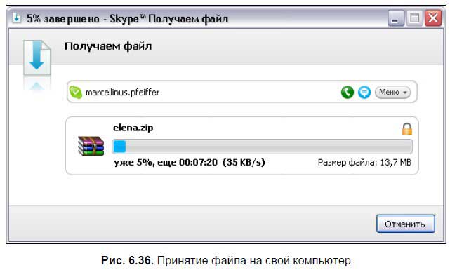 Пользователь сам решает, разрешить или отказать в приеме файлов. Если нажать команду Разрешить , то начнется прием файла (рис. 6.36).