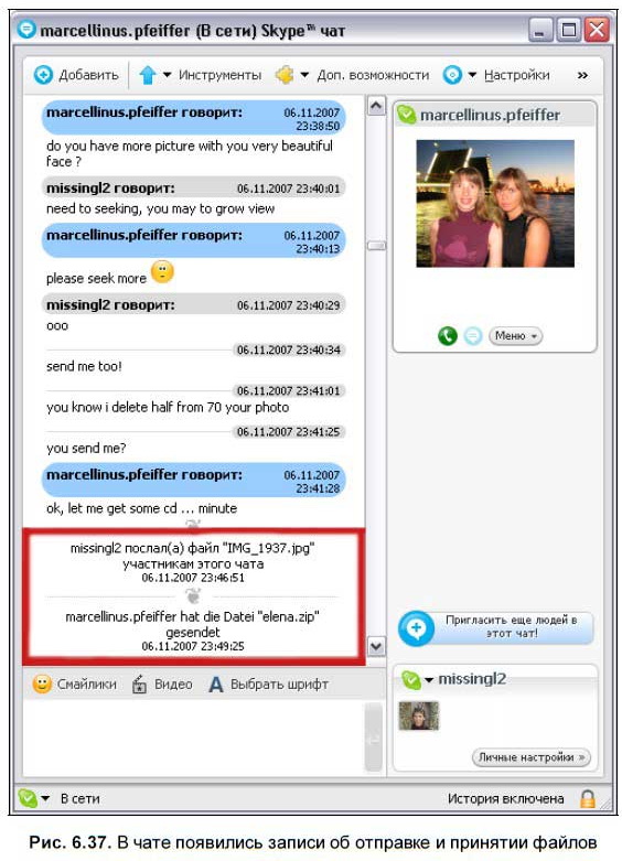 Непосредственно перед принятием файла нужно указать в появившемся окне, где будет сохранен файл. Лучше создать отдельную папку для файлов Skype, чтобы не «захламлять» свой Рабочий стол. Успешная отправка и прием файлов фиксируются записями, которые автоматически появляются в текстовом поле окна чата (рис. 6.37). В записи указан абонент, отправивший файл, имя файла и время отправки.