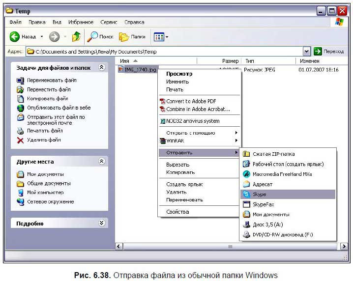 Пересылка файла из ПроводникаПереслать файл можно непосредственно из Проводника или других программ, поддерживающих контекстное меню с пунктом Отправить . Найдите файл с помощью программы Проводник или через Мой компьютер . Щелкните правой кнопкой мыши на имени файла и в контекстном меню выберите команду Отправить. В раскрывающемся списке укажите Skype (рис. 6.38).