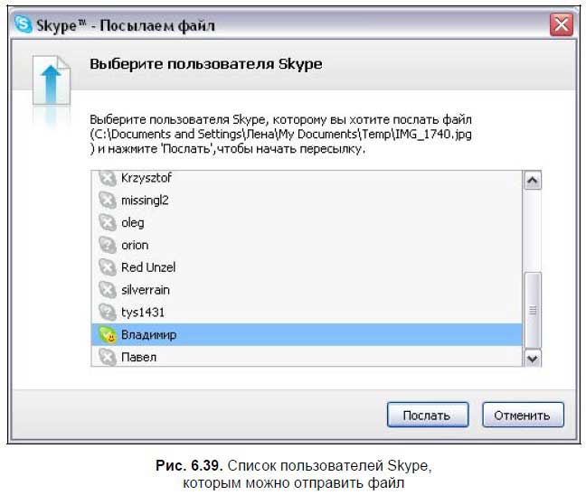 Откроется окно со списком контактов Skype (рис. 6.39), выберите абонента и нажмите кнопку Послать .