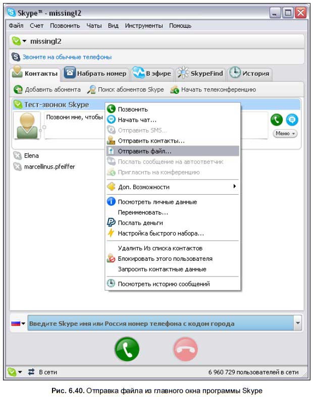 Если абонент, которому вы посылаете файл, разрешит принятие файла, то начнется его пересылка. Пересылка файла из главного окна программы SkypeДля пересылки файла из главного окна программы Skype перейдите на вкладку Контакты . В списке контактов выберите абонента, которому вы будете посылать файл. Щелкните на строке контакта правой кнопкой мыши, и в контекстном меню выберите команду Отправить файл… (рис. 6.40).