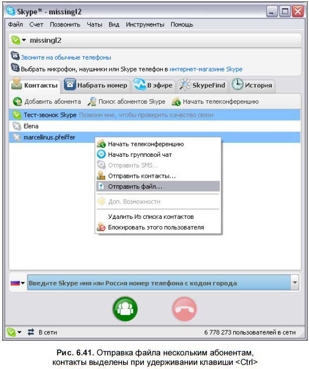 В открывшемся окне (см. рис. 6.31) укажите файл для отправки и нажмите кнопку Открыть . Если абонент, которому вы посылаете файл, разрешит принятие файла, то начнется его пересылка. Пересылка файла нескольким абонентамПересылка файла нескольким абонентам ничем не отличается от пересылки файла одному абоненту. На вкладке Контакты главного окна программы Skype выделите несколько контактов, удерживая нажатой клавишу <Ctrl> – для выделения несмежных контактов, или <Shift> – для выделения смежных контактов. Используйте команду Отправить файл… из контекстного меню (рис. 6.41).