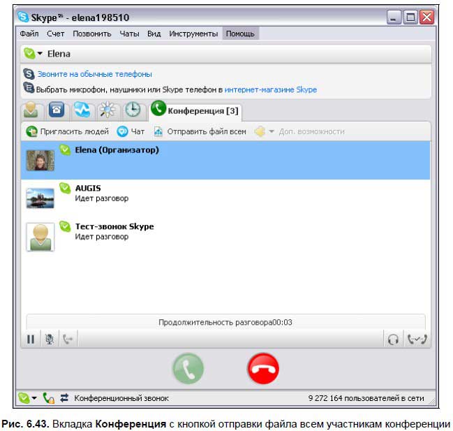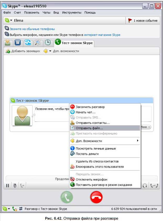 Пересылка файла начнется для тех пользователей, которые дадут на это свое согласие. Пересылка файла во время разговораЧтобы переслать файл во время разговора, используется команда контекстного меню Отправить файл… Начните звонить выбранному абоненту, тогда в окне программы Skype автоматически будет создана вкладка с названием, таким же, как и Skype‑имя абонента. Щелкните правой кнопкой мыши на строке контакта и в контекстном меню выберите команду Отправить файл… (рис. 6.42).