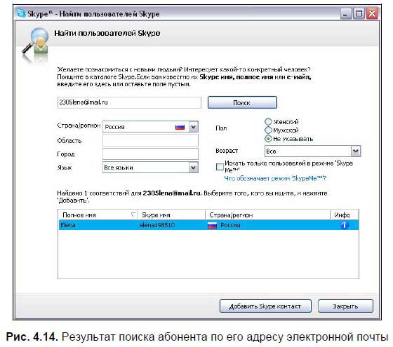 Сам процесс поиска может заключаться в нахождении абонента Skype (при этом он должен быть зарегистрирован в сети Skype) по Skype‑имени, полному имени и адресу электронной почты. Дополнительно можно задать поиск с указанием страны, области, города, языка, пола и возраста. На рис. 4.13 приведен пример поиска абонента по его адресу электронной почты. После задания границ поиска нажмите кнопку Поиск . Если поиск занимает длительное время, то его можно остановить при помощи кнопки Остановить поиск. Результат поиска представлен на рис. 4.14.
