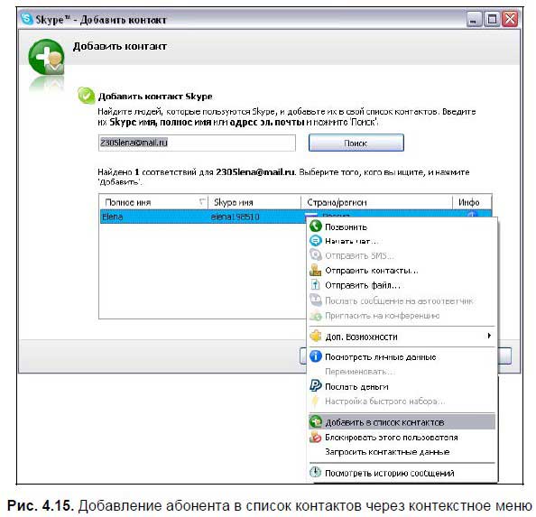 Добавление абонентовТеперь, когда абонент найден, можно добавить его контакты в свою записную книжку с запросом контактной информации. Добавление Skype‑контакта можно выполнить следующими способами: 1. Нажмите кнопку Добавить Skype контакт в диалоговом окне поиска пользователей Skype (см. рис. 4.14). 2. Вызовите контекстное меню выбранного контакта, щелкнув для этого на контакте правой кнопкой мыши. Выберите команду Добавить в список контактов (рис. 4.15).