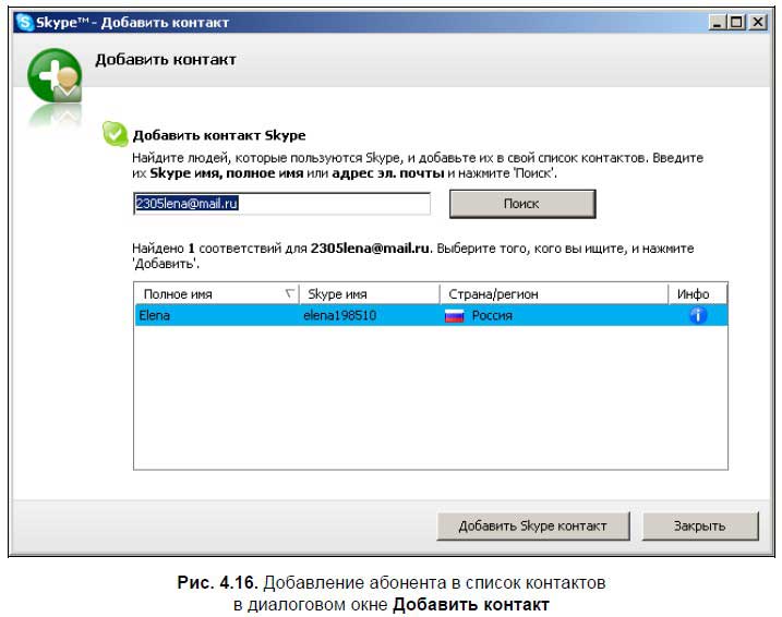 3. Нажмите кнопку Добавить абонента , расположенную на вкладке Контакты программы Skype. Появится диалоговое окно (рис. 4.16) для упрощенного поиска абонента только по Skype‑имени, полному имени или адресу электронной почты без указания страны, пола и т. д. После успешного поиска нажмите кнопку Добавить Skype контакт .