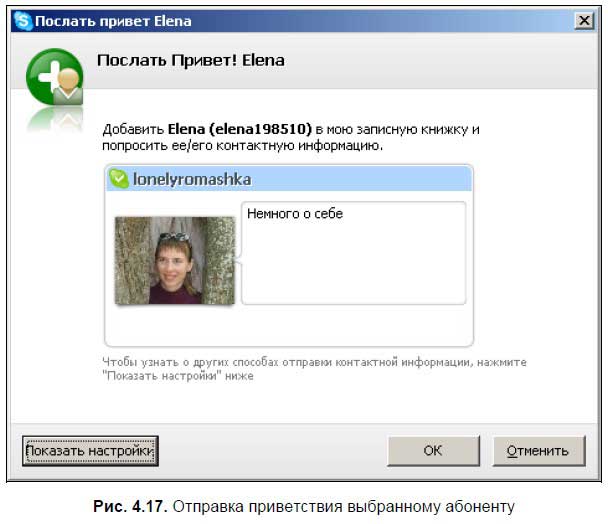 4. Выберите команду меню Инструменты | Добавить Skype контакт , появится такое же окно поиска, как и при выполнении команд в п. 3. Проведите поиск и нажмите кнопку Добавить Skype контакт . Отправка приветствияКак только вы нажмете кнопку Добавить Skype контакт , появится запрос на отправку приветствия выбранному абоненту (рис. 4.17). Нажав кнопку Показать настройки , можно выбрать переключатели Дать мою контактную информацию этому пользователю или Не давать мою контактную информацию этому пользователю. Если не давать контактную информацию, то абонент не сможет увидеть вашу фотографию. Обратите внимание, что обмениваться контактами можно, если оба пользователя находятся в сети Skype.