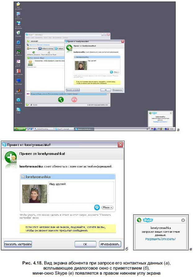 В текстовом поле рядом с аватаром (мини‑фотографией или другой характеризующей абонента картинкой) можно написать несколько слов о себе и целях запроса контактной информации. Нажмите кнопку OK , и если пользователь, с которым вы хотите контактировать, будет в сети Skype, то у него на Рабочем столе (рис. 4.18, А) появится отосланное вами окно с приветствием и всплывающее мини‑окно. Абонент решает, хочет ли он с вами общаться, и если да, то нажимает кнопку OK (рис. 4.18, Б). Также можно щелкнуть ссылку Разрешить в мини‑окне (рис. 4.18, В).