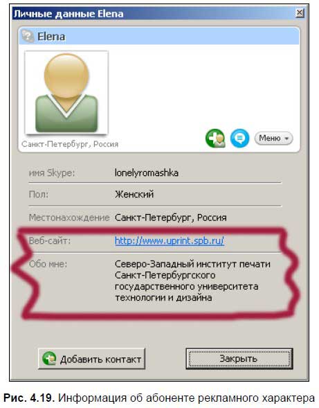 Даже если пользователь не добавил вас в список контактов, ему можно звонить и посылать сообщения, но более широкие возможности для общения, как, например, отправка файла, недоступны. Реклама своего имени в SkypeДля того чтобы информация о вас была доступна всем абонентам сети Skype, воспользуйтесь услугой Skype MeТМ. Когда вы просто находитесь в сети, то об этом свидетельствует индикатор, расположенный справа на Панели задач. Вы можете общаться только с друзьями, занесенными в список контактов. При смене индикатора В сети на индикатор Skype Me™ ваши данные доступны всем и видны при поиске в диалоговом окне поиска абонентов Skype (см. рис. 4.14). Для чего применяется данный режим: 1. Для знакомства с другими абонентами сети из разных стран, городов, возрастных групп. 2. Для рекламы своего имени, а также любой другой информации в Skype. Как происходит реклама? В режиме Skype Me™ другой пользователь находит вас в списке абонентов, готовых к общению. Естественно, ему хочется узнать о вас больше, чем Skype‑имя и место проживания. Тогда можно просмотреть личные данные абонента. Для этого достаточно щелкнуть правой кнопкой мыши на строке с данными найденного абонента и в контекстном меню указать Посмотреть личные данные (команда видна на рис. 4.15). А вот и реклама! (рис. 4.19).
