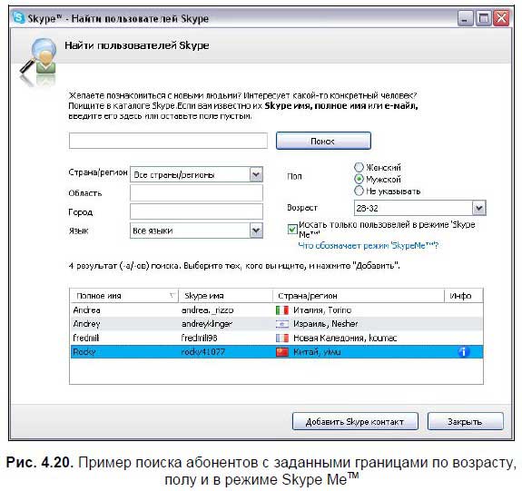 На рисунке видно, что указан веб‑сайт и название организации, эти данные не являются личными, но абонент хочет, чтобы они были видны всем. Границы поиска абонентовЧтобы разграничить зону поиска абонентов, для более быстрого целенаправленного поиска используется диалоговое окно поиска новых абонентов, вызываемое командой меню Инструменты | Найти пользователей Skype (рис. 4.20). В нем можно задать поиск с указанием страны, области, города, языка, пола и возраста. Если вы ищете абонентов в режиме Skype Me™, то установите флажок Искать только пользователей в режиме ‘Skype Me™’ (рис. 4.20).