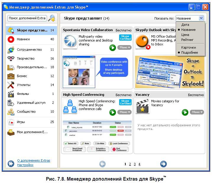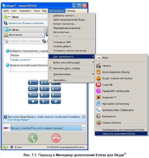 Список программ содержит Менеджер дополнений Extras для Skype™ , который можно вызвать с помощью команды основного меню программы Skype Инструменты | Доп. возможности | Загрузить дополнения Extras (рис. 7.7).