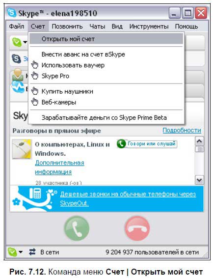 Чтобы открыть свой собственный счет в Skype, воспользуйтесь командой Счет | Открыть мой счет (рис. 7.12).