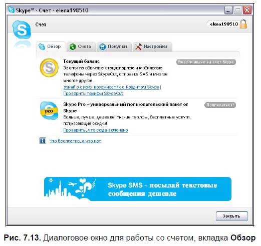 □ Обзор – включает информацию о текущем балансе и о предложении Skype Pro. Щелкнув ссылки, можно получить более подробную информацию об услугах (рис. 7.13);