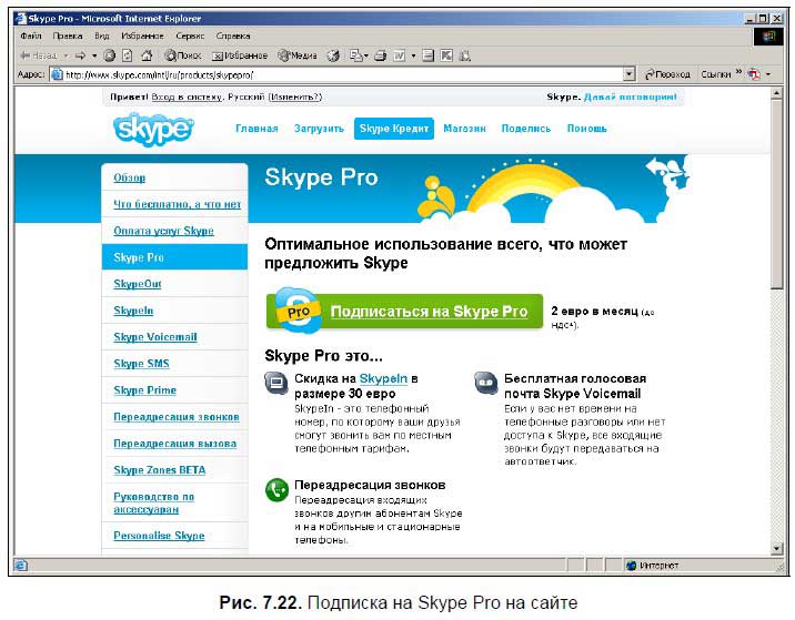 Откроется следующая веб‑страница (рис. 7.22), которая имеет адрес http://www. skype. com/intl/en/allfeatures/skypepro/. Русскоязычная страница находится по адресу http://www. skype. com/intl/ru/products/skypepro/.