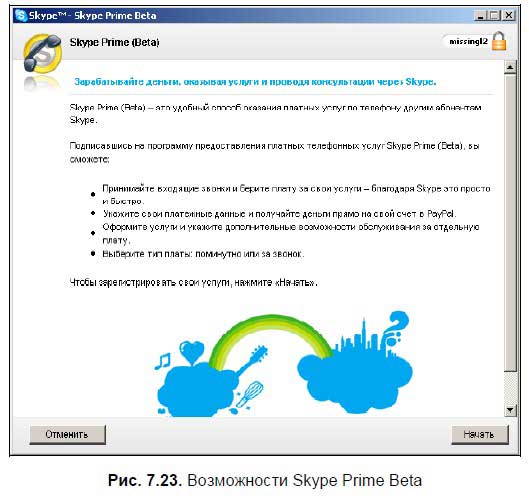 1. Выполните команду основного меню программы Счет | Зарабатывайте деньги со Skype Prime Beta… В открывшемся окне содержится информация о данном сервисе и способе подписки (рис. 7.23). Для регистрации своей услуги нажмите кнопку Начать .