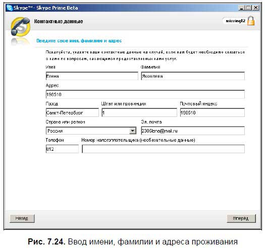 2. В новом окне (рис. 7.24) укажите ваши контактные данные, чтобы администрация Skype могла с вами связаться. Нажмите кнопку Вперед .