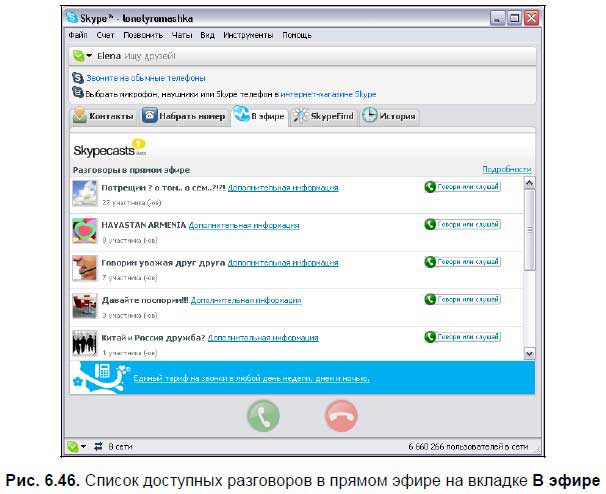 После успешного поиска разговоров в окне программы Skype на вкладке В эфире будет виден список доступных разговоров (рис. 6.46).