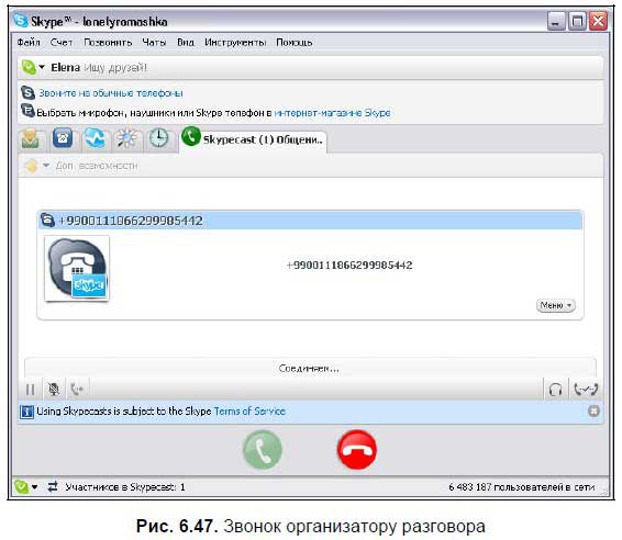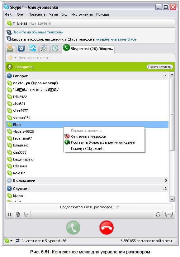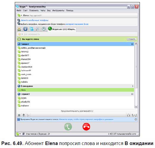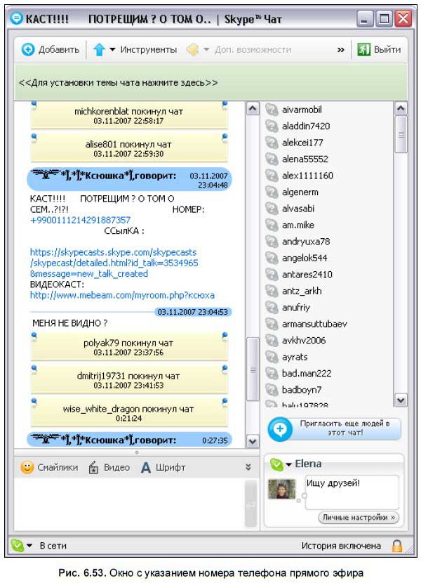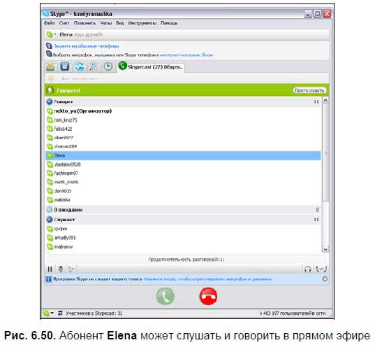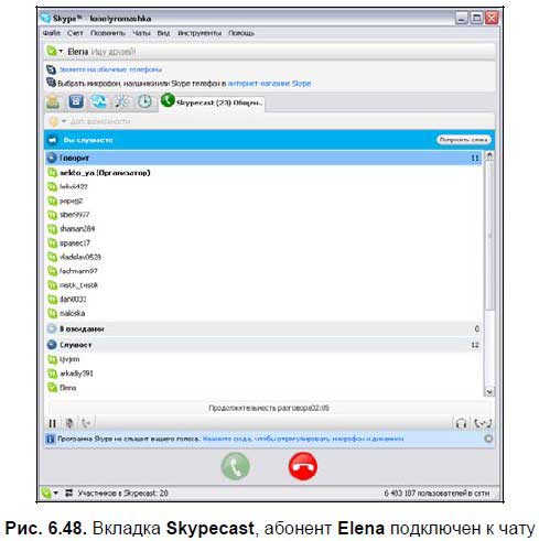 3. В случае успешного соединения вы будете подключены к разговору (рис. 6.48). Он отображается на автоматически созданной вкладке Skypecast (23) , где 23 – это число участников разговора в прямом эфире. Обратите внимание, что новый подключенный абонент (Elena ) находится в поле Слушает и пока не имеет возможности говорить в прямом эфире.