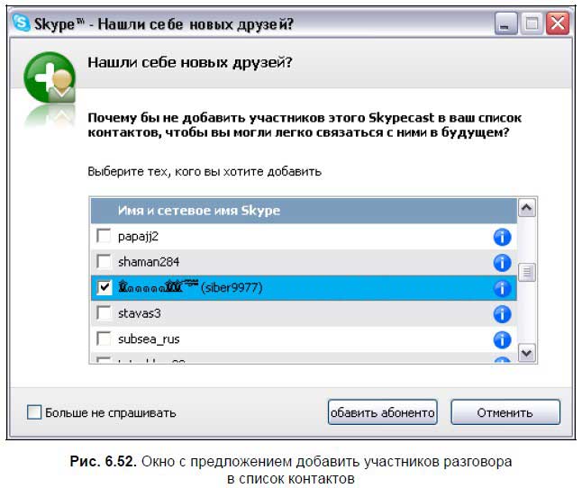Вы будете отключены от разговора, но сам разговор будет продолжаться, пока его не прекратит организатор. При прекращении разговора появится диалоговое окно (рис. 6.52) с предложением добавить участников Skypecast в список контактов. Установите флажки напротив понравившихся абонентов, с которыми вы хотите контактировать в будущем, и нажмите кнопку Добавить абонентов .